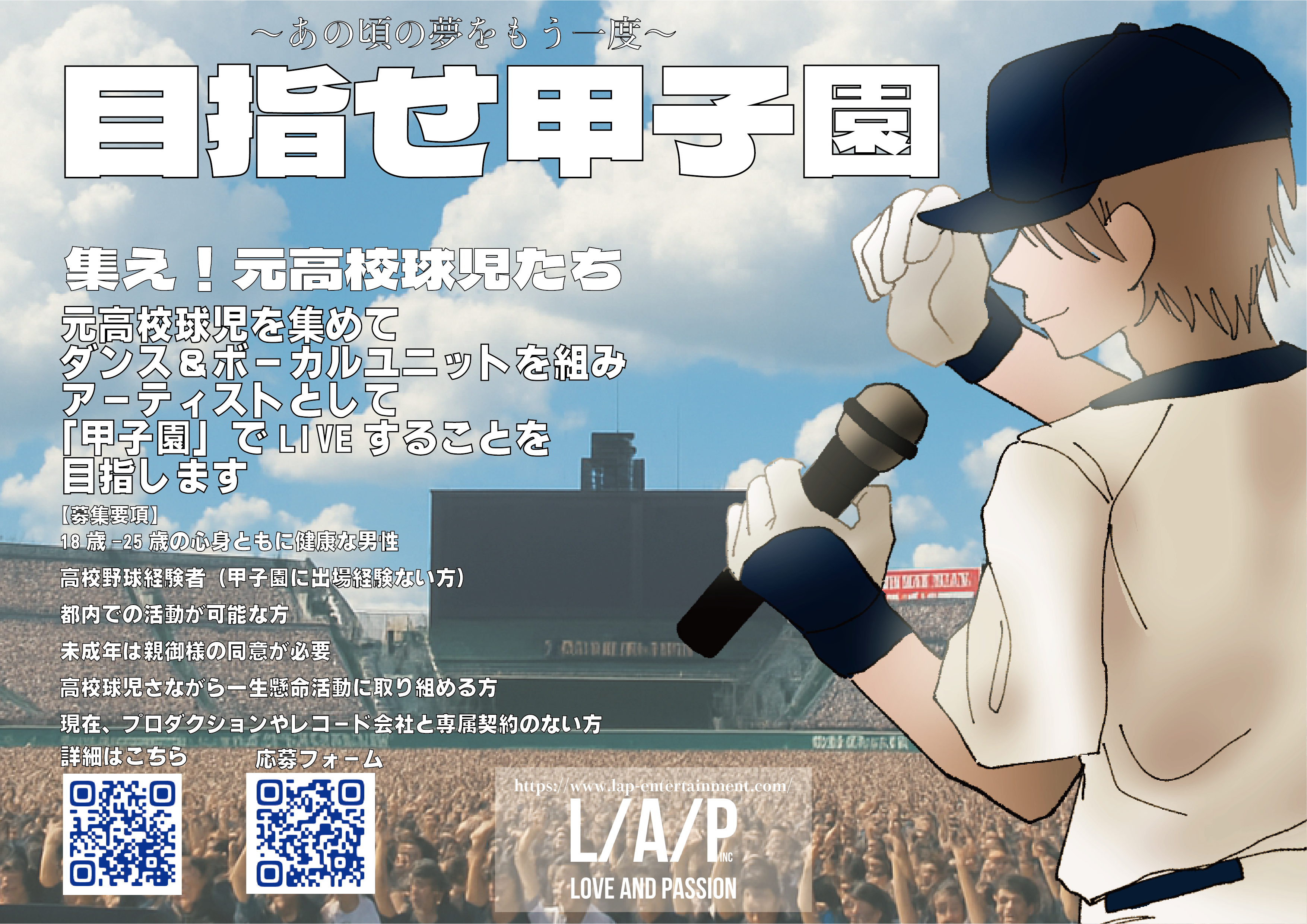 元高校球児がメンズアイドルとして甲子園球場でワンマンライブすることを目指します。今回はそのメンバー募集です。