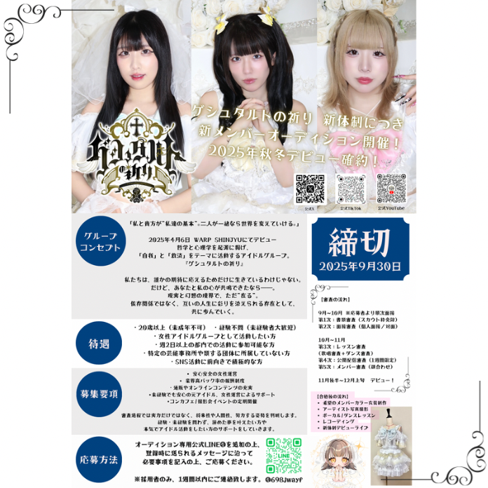 オーディション専用公式LINE@を追加の上、登録時に送られるメッセージに沿って、必要事項を記入の上、ご応募ください。※採用者のみ、1週間以内にご連絡致します。