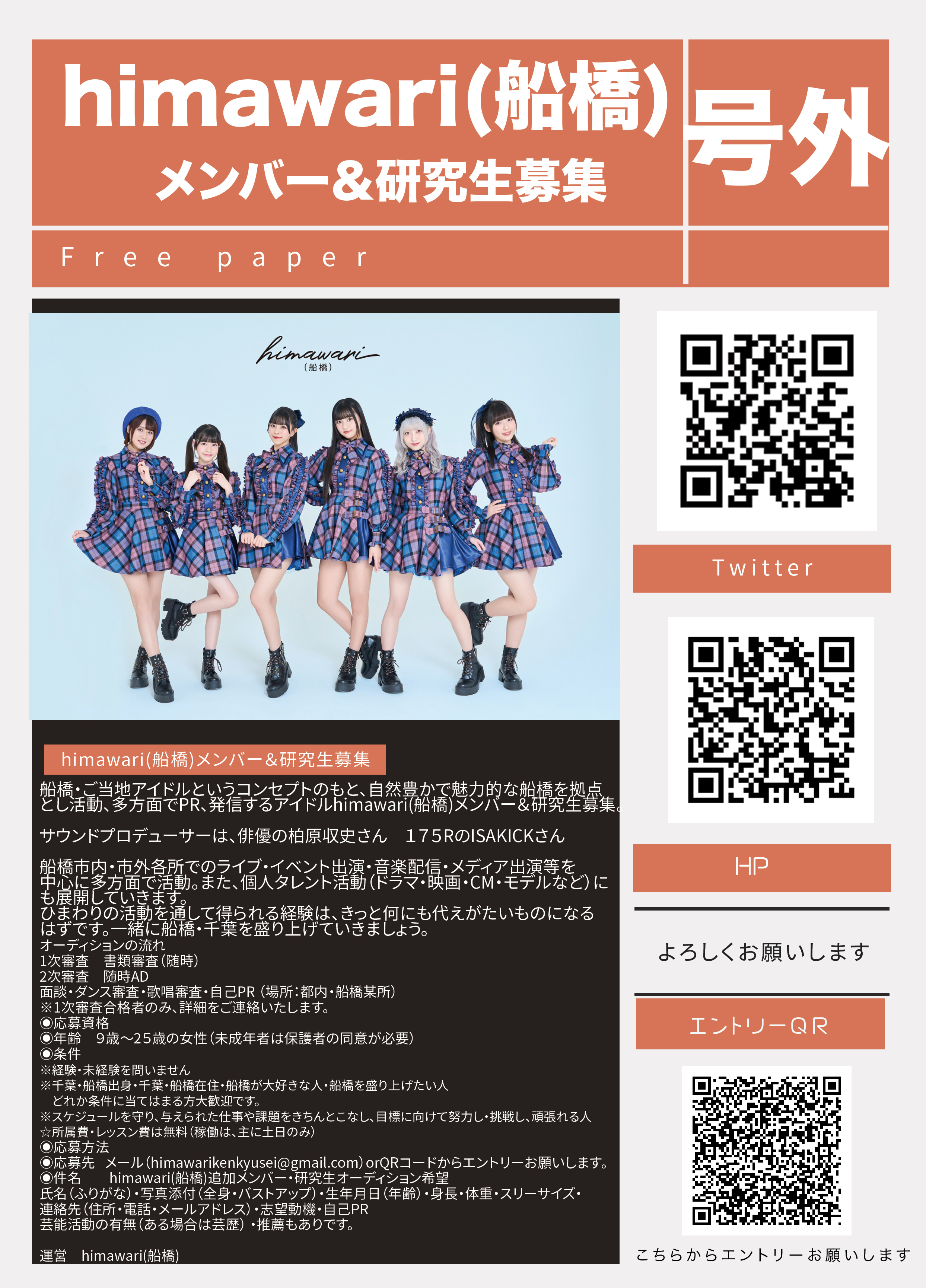 船橋・ご当地アイドルというコンセプトのもと、自然豊かで魅力的な船橋を拠点とし活動、多方面でPR、発信するアイドル。himawari(船橋)メンバー&研究生の募集です。