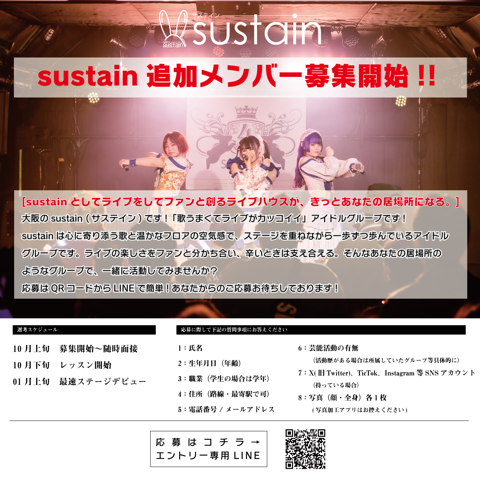 ・大阪市内のライブ・レッスンに週4〜5日参加(平日昼稼働あり)でき、アイドル活動を最優先できる人