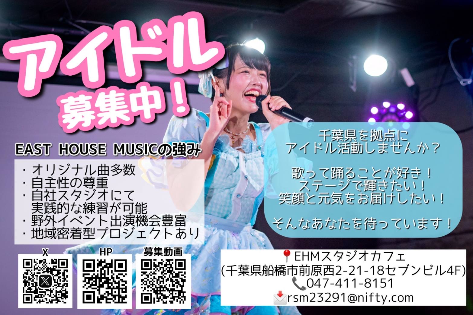 EAST HOUSE MUSICといいます、音楽事務所、ライブハウス、カフェなどの事業展開しています。拠点は千葉県船橋市(津田沼)です。私達は千葉県を音楽で盛り上げる活動をメインに都内、全国に発信していくアイドル活動をしています。地域社会の方達、団体様と一緒に地域のイベント、祭りに出演し沢山の方達との応援、交流をしています。