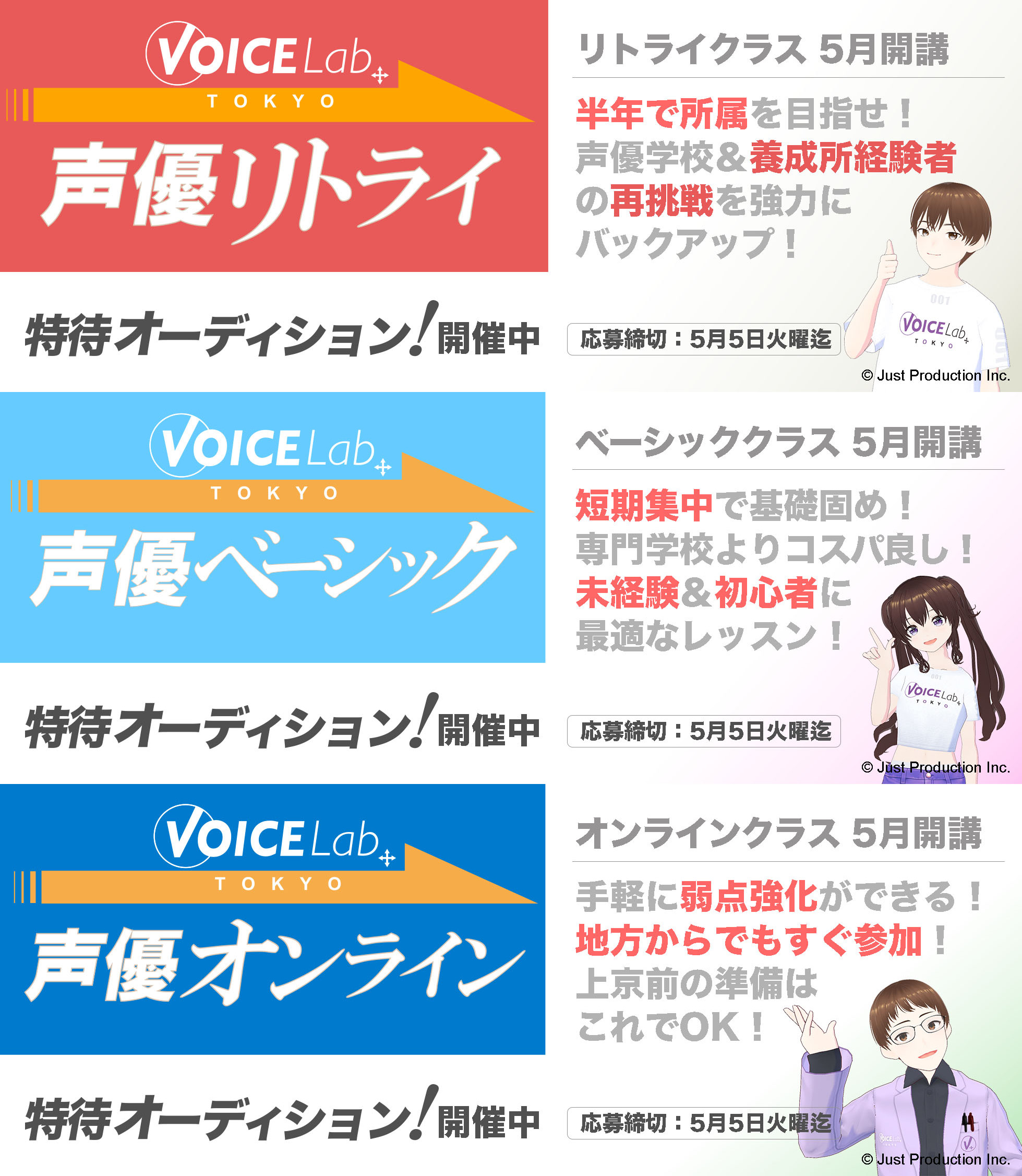 声優プロダクション「ジャスト プロボイス」の附属養成機関ボイスラボトーキョー(https://voicelab.tokyo)が、他の声優養成所や声優学校で成果が出せなかった方の再挑戦をバックアップする「リトライクラス」と、未経験者や初心者を対象に短期集中で基礎から学べる「ベーシッククラス」、地方からでも今すぐ学べる「オンラインクラス」を対象とした、特待生オーディションを開催!